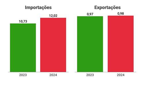 No ano passado, um dos principais fatores para o déficit foi o caminho oposto seguido pelas importações e exportações. Enquanto as compras subiram 12% em comparação com 2023, as vendas retraíram 1%.