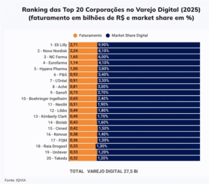 O ranking das 20 maiores corporações evidencia um mercado digital que movimentou, no total, R$ 27,5 bilhões no período, com um crescimento geral de 61,9%. A lista também destaca a presença relevante de indústrias de bens de consumo e higiene (HPC) no ambiente de farmácia online. A P&G aparece na sexta posição (R$ 514 milhões) e Unilever fechando a lista em 19º (R$ 327 milhões).