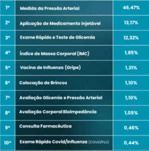 Entre as estatísticas apresentadas, destaca-se o ranking de serviços de saúde mais realizados nas farmácias brasileiras ao longo do último ano.