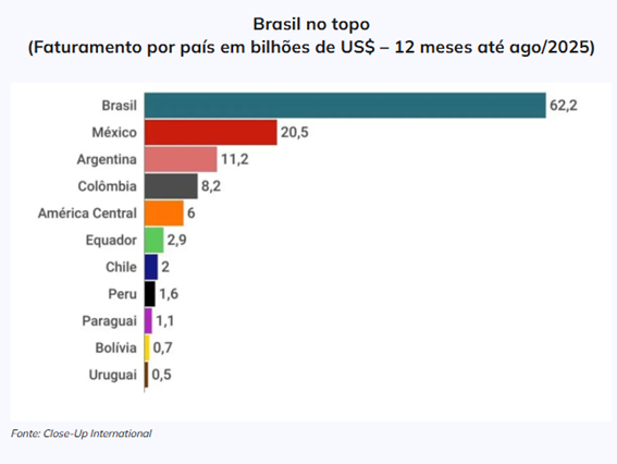 Segundo o Outlook 2025 da Close-Up International, o setor movimentou US$ 116,9 bilhões (R$ 629,3 bilhões) nos últimos 12 meses até agosto de 2025. Desse montante, 70,7% ficou concentrado nas nações que, somadas, têm mais de 340 milhões de habitantes.