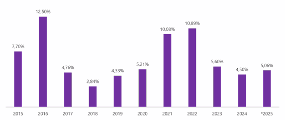 Janeiro liderou o avanço, com variação de 8,4% frente ao mesmo mês de 2024
