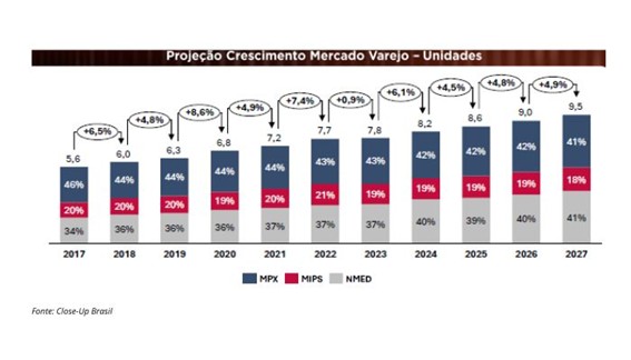 Mas é no faturamento (considerando preços ao consumidor) que o impulso será mais expressivo: o mercado deve registrar alta de 8,5% ao ano até 2027.