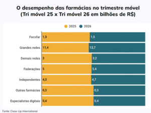 O avanço foi 1,1 ponto percentual acima da média do varejo farmacêutico, que apresentou um ganho de 8,9% no mês. O movimento coroa um trimestre móvel (de dezembro de 2025 a fevereiro de 2026) igualmente vitorioso.