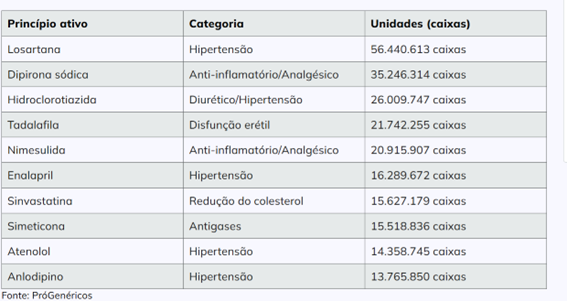 Com 56,4 milhões de caixas vendidas, a losartana, usada no controle da pressão arterial, foi o princípio ativo mais comercializado no período. Além dela, outros quatro medicamentos entre os dez mais vendidos também são indicados para hipertensão.