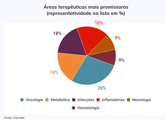 O relatório da Clarivate ainda detalha os segmentos terapêuticos presentes no ranking dos medicamentos mais promissores. O mercado oncológico lidera a lista, reunindo 28% dos fármacos, seguido pelas classes metabólicas, inflamatórias e de infecções, que somam 18% do total