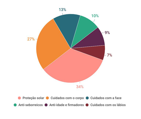 Segundo a IQVIA, 34% do faturamento do mercado de dermocosméticos está concentrado na subcategoria de proteção solar. Em seguida aparecem cuidados com o corpo (27%) e com a face (13%).