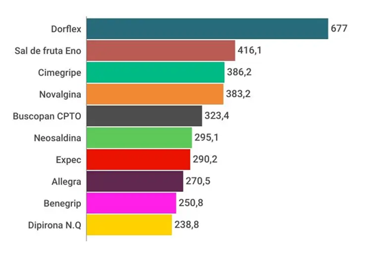 Com folga, o Dorflex – combinação de dipirona monoidratada, citrato de orfenadrina e cafeína anidra da Sanofi – foi o medicamento mais comercializado no período. Nos 12 meses até junho, registrou R$ 677 milhões em vendas.