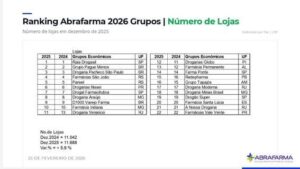 As redes associadas à Abrafarma encerraram 2025 com 11.688 pontos de venda, um aumento de 5,9% em relação ao ano anterior. Nesse quesito, a RD Saúde manteve a liderança, em número de lojas, com o Grupo Pague Menos consolidando-se no segundo lugar.