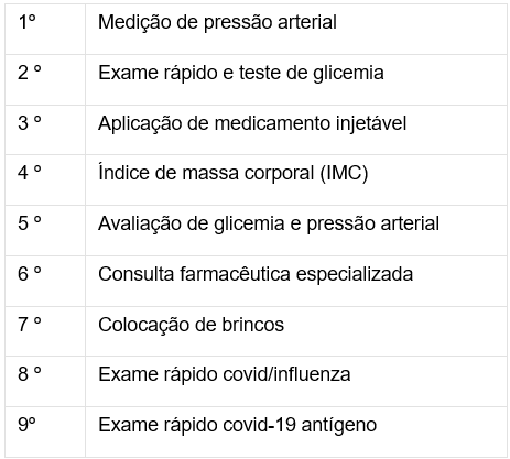 Com isso, o canal tem se tornado um hub de saúde, oferecendo serviços como consultas farmacêuticas, aplicação de vacinas, exames de análises clínicas, triagem e monitoramento de doenças crônicas, acompanhamento de parâmetros, como pressão arterial, níveis de glicose e colesterol, e campanhas educativas em saúde, entre outros1.