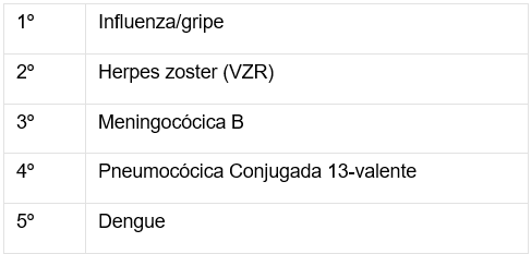 - A vacina contra a Influenza ficou em primeiro lugar no número de doses aplicadas, correspondendo a 25% do total. Também houve aumento na procura por vacinas como Herpes Zoster e Meningocócica B.