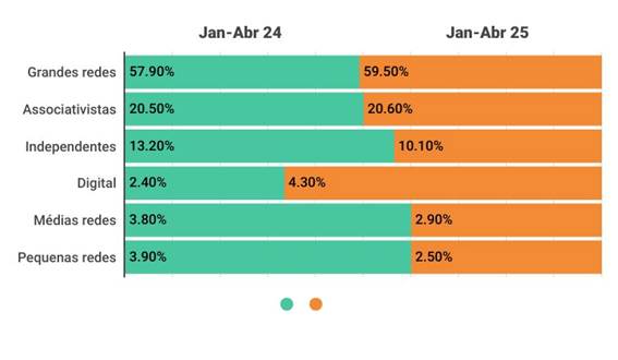 O desempenho da categoria no varejo farmacêutico de janeiro a abril deste ano mostra uma predominância das grandes redes, que representam 59,5% do mercado, com as associativistas em segundo lugar, que contabilizam 20,6% de participação. “Os indicadores mostram o potencial latente das drogarias regionais como canais para alavancar o mercado de suplementos”, acredita Costa.