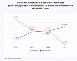 O número de lojas inauguradas no Brasil teve um recuo de 39,3% na comparação entre 2022 e 2025. Este último ano, inclusive, foi o primeiro a registrar um volume de novos PDVs menor que o de fechamentos.