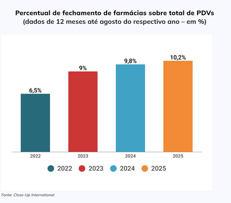 O índice de fechamento de farmácias chegou ao seu maior nível e pela primeira vez representa mais de 10% do total de lojas com operações iniciadas nos últimos três anos. Os dados da Close-Up International correspondem aos últimos 12 meses até agosto de 2025 e a explicação passa, sobretudo, pelos estabelecimentos de pequeno porte.