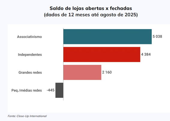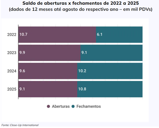 O varejo independente e as pequenas e médias redes puxam o crescimento para baixo, com “altas” de apenas 5,5% e 7%. Esse desempenho reflete-se diretamente na capilaridade. Dos 10.766 pontos de venda que descontinuaram operações em 12 meses, 94% pertenciam a esses dois nichos, o que ajuda a explicar o saldo de fechamentos maior que o de aberturas pelo segundo ano consecutivo.