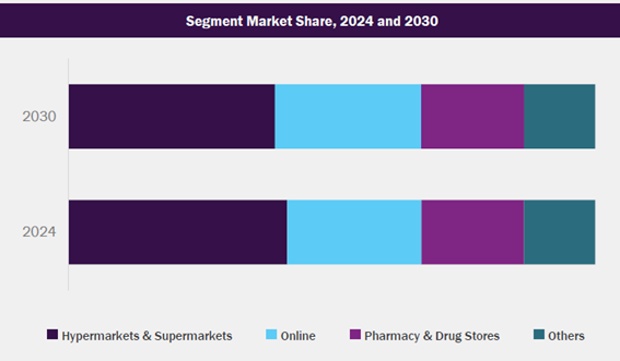 No recorte por canais, o estudo mostra que a distribuição está dividida, principalmente, nas vendas em hiper e supermercados, farmácias e e-commerce.